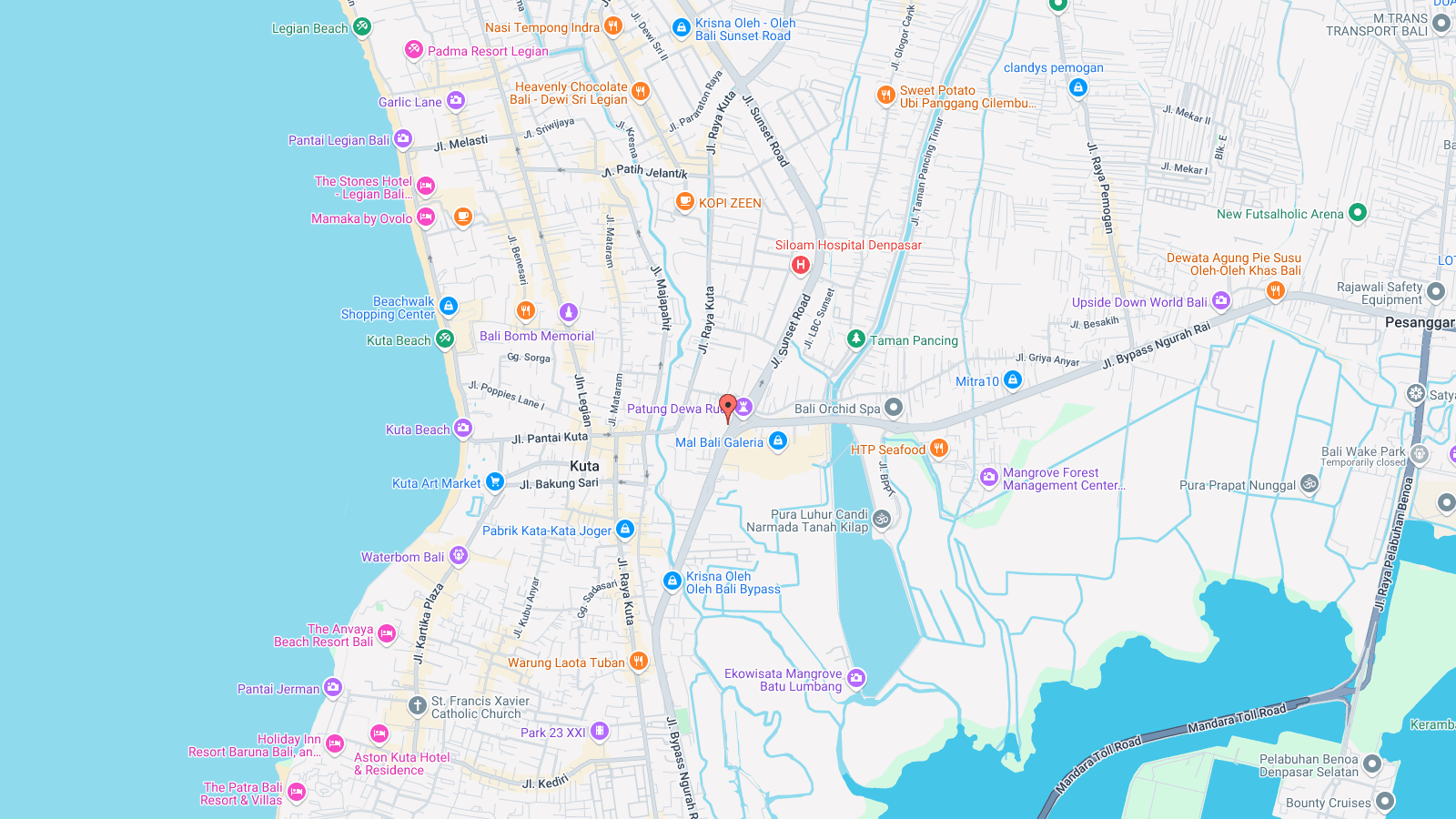 Beside Bali Paintball Arena, Jalan Legian Kuta, Beach Walk Kuta, Bali Plaza, Sars Wisata Budaya Kuta, The Umalas Equestrian Resort Kuta, Odyssey Submarine Voyage of Fantasy Bali, Legian beach, Bali Shell Museum, Miniapolis Bali, Kuta Square, Kuta Theater, Banjar Hot Springs, Balian beach Kuta, New Kuta Green park, Waterbom Kuta, Bali Bomb memorial, Kuta beach you can try Kuta Chinese Dragon Reflexology.